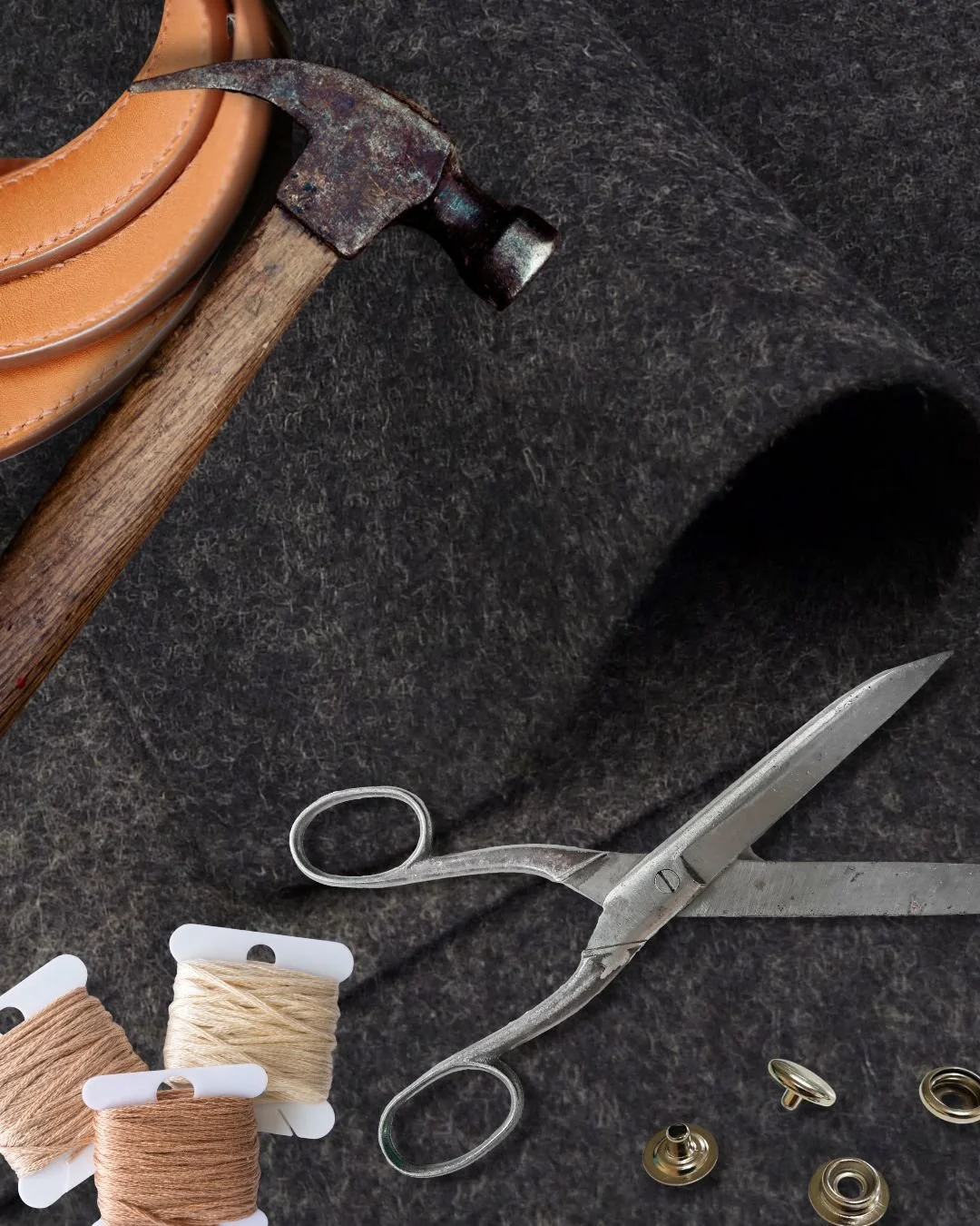 What you’ll make: You’ll make your own wearable pocket bag using a piece of 100% wool felt which can be cut to suit your phone – or a bit bigger if you’d like to be able to carry other treasures. You’ll use embroidery thread (or plain thread) to sew it together and can personalise it with found materials to suit your own style. We’ll add a brass dome fastening and strap anchors, and finish the bag with a beautiful vegan leather (PU) adjustable strap.