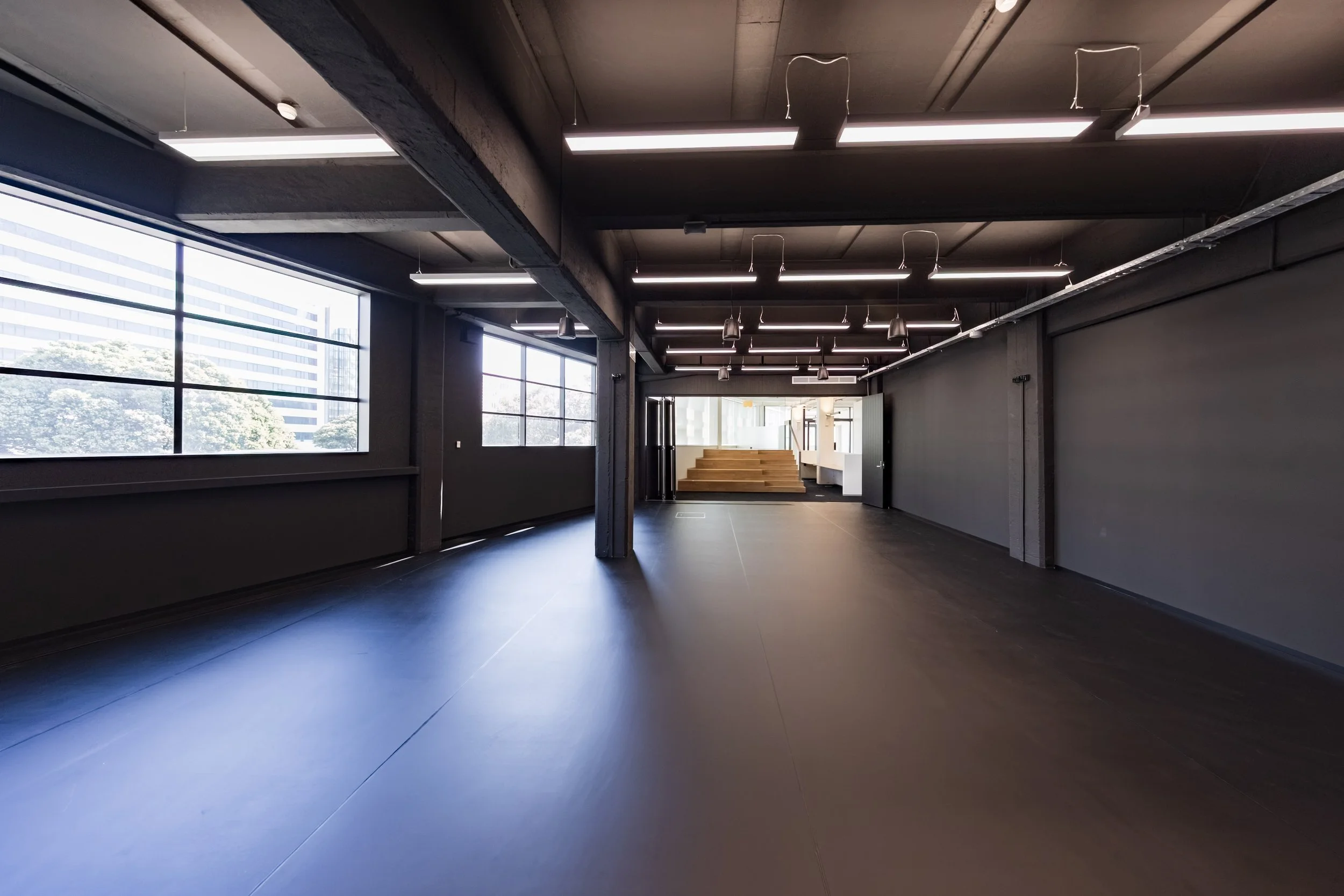 The combined performance space creates a large, open performance environment by joining the multipurpose studio and poutama space through an operable wall.
